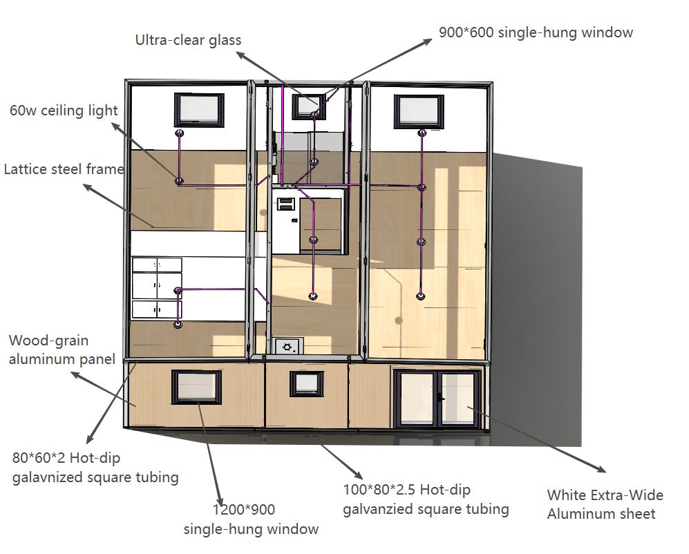 At the core of this expandable container house is a high-strength latticed steel frame structure designed to withstand repeated folding, transportation stress, and long-term residential use. The structural system ensures high load-bearing capacity, anti-deformation stability, and improved safety performance.
