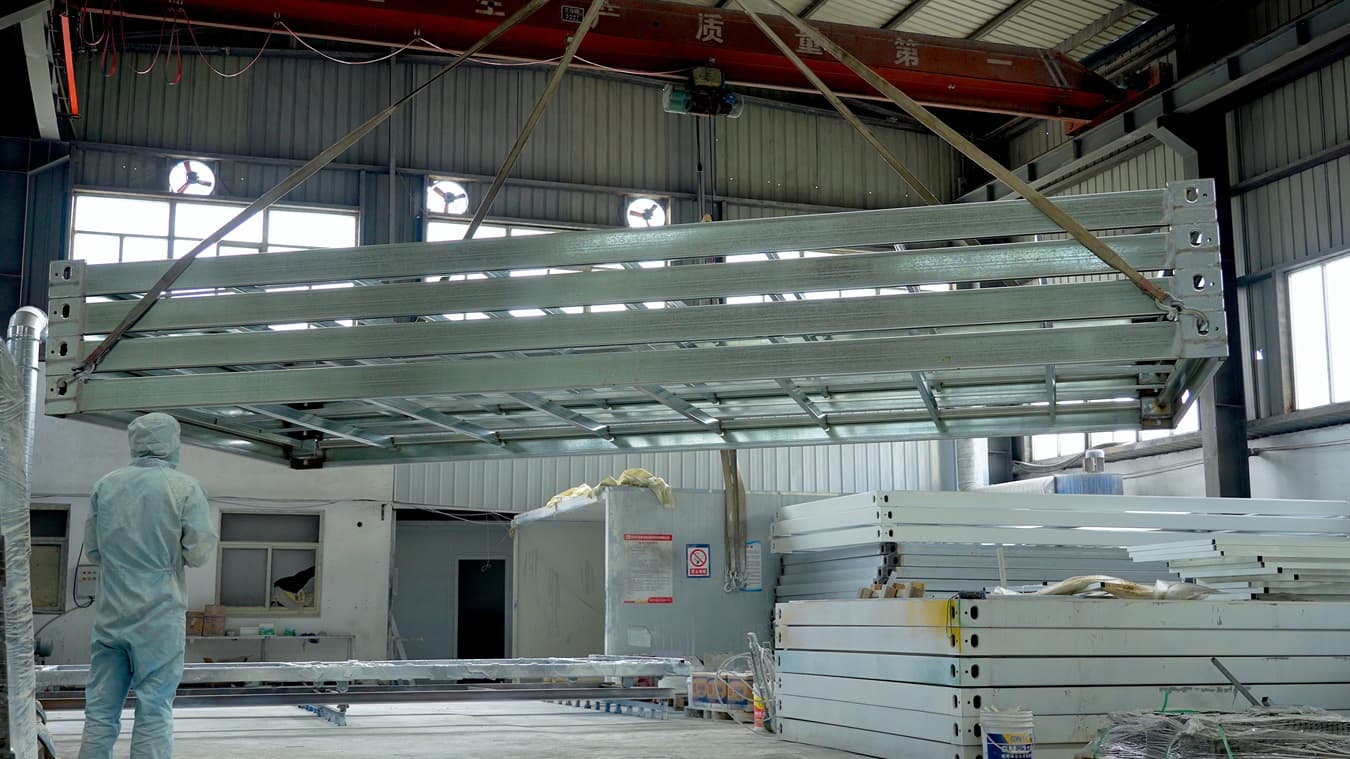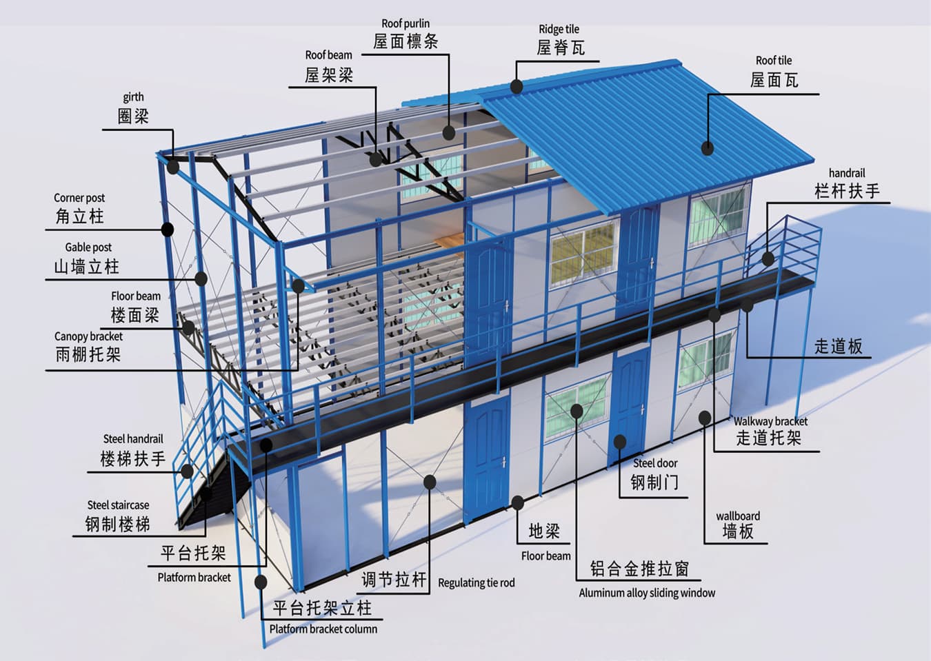 أ:الهيكل الرئيسي مصنوع من الفولاذ المجلفن عالي القوة على شكل حرف C/U؛ لوحة جدار العلبة عبارة عن لوحة شطيرة، ويمكن اختيار المادة الأساسية من الصوف الصخري والبولي يوريثين.